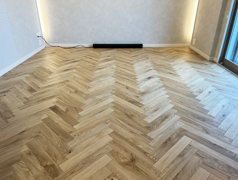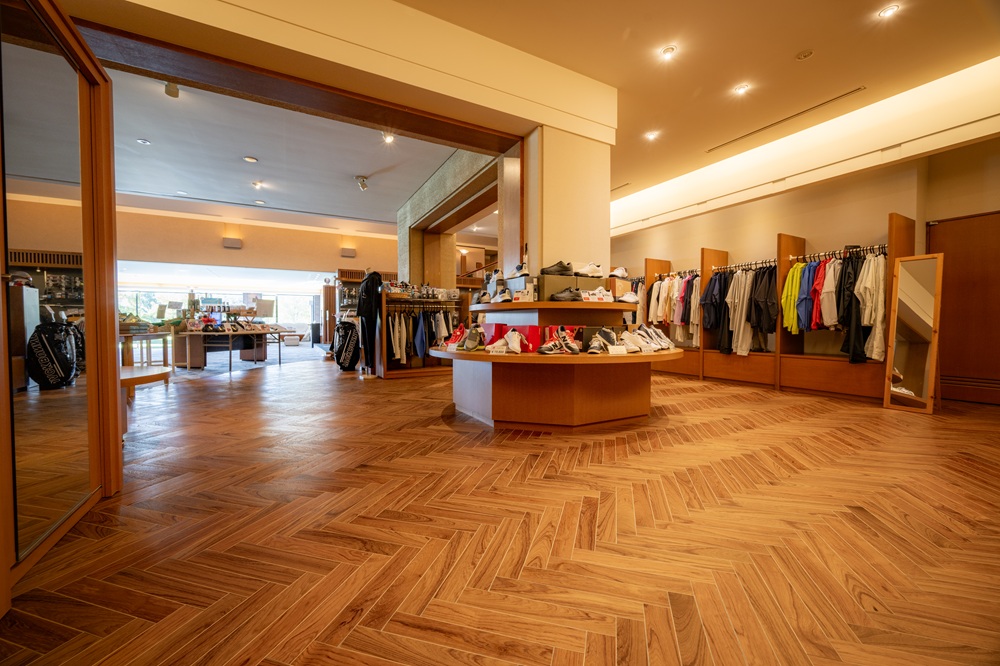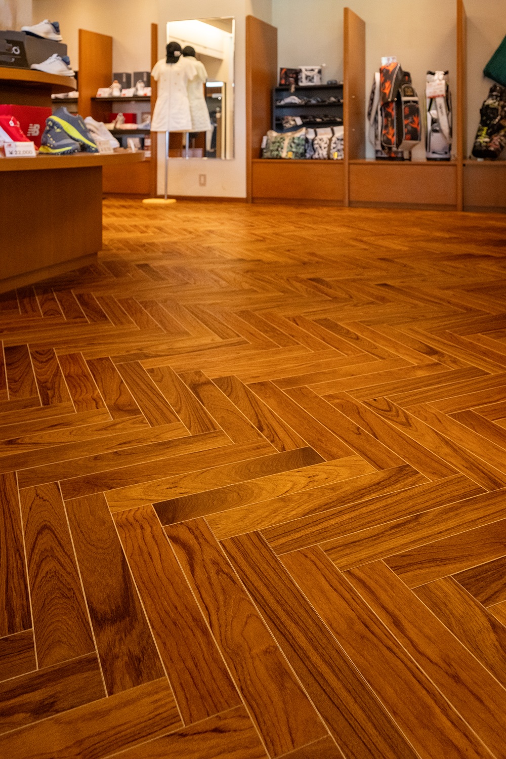 Thinthia Herringbone creates a rhythmic pattern. The pattern that makes use of natural wood knots with different expressions creates a unique retail space with a high design.